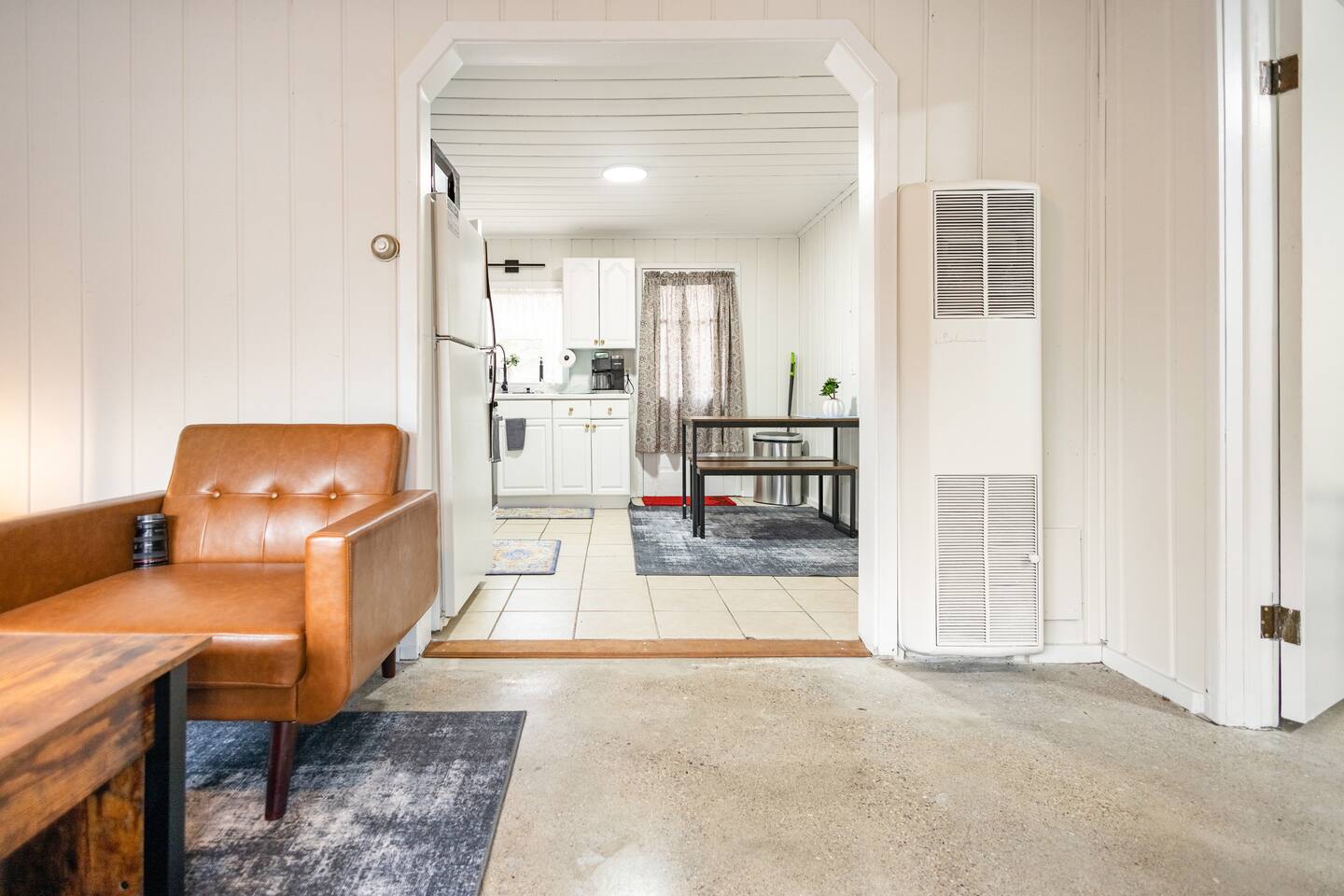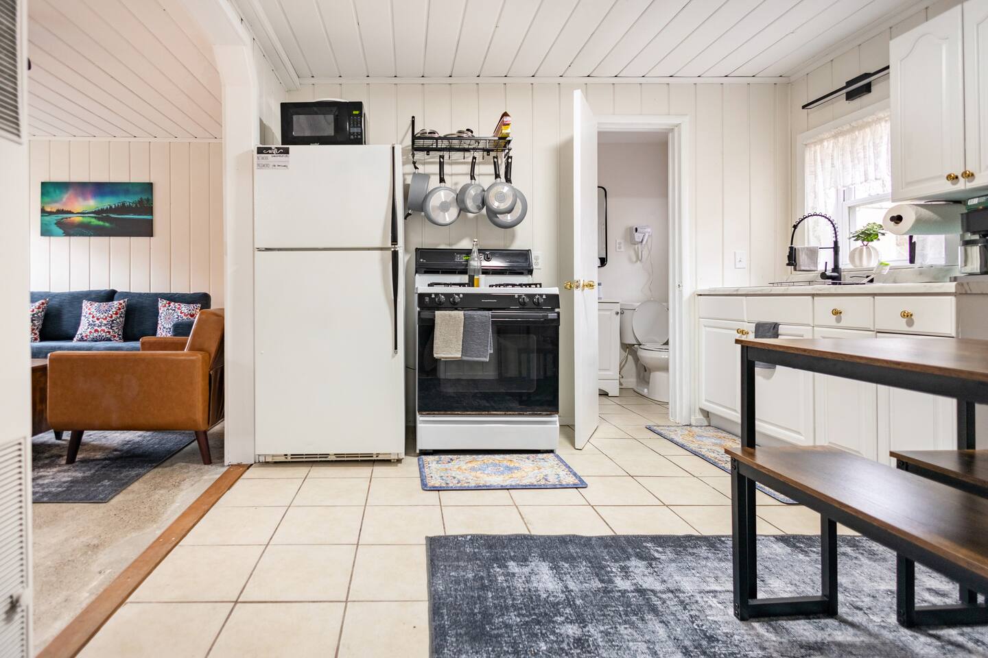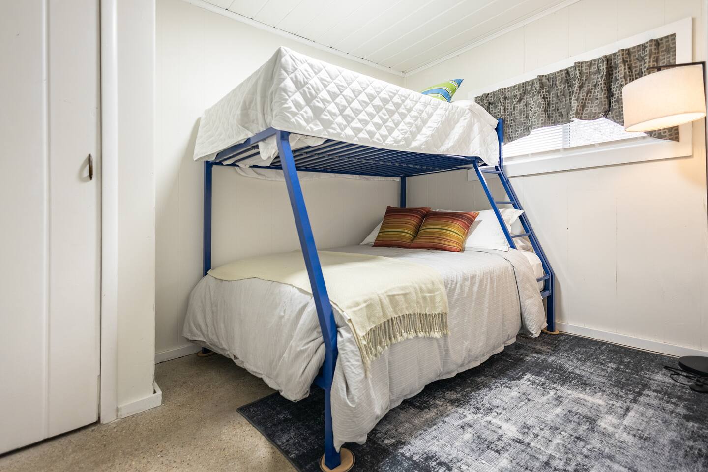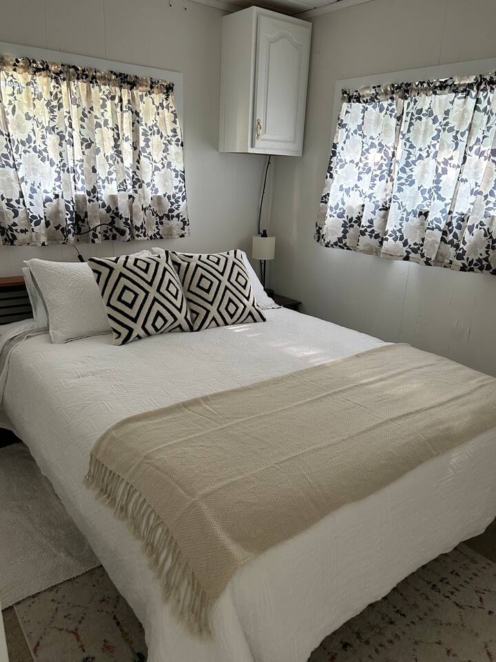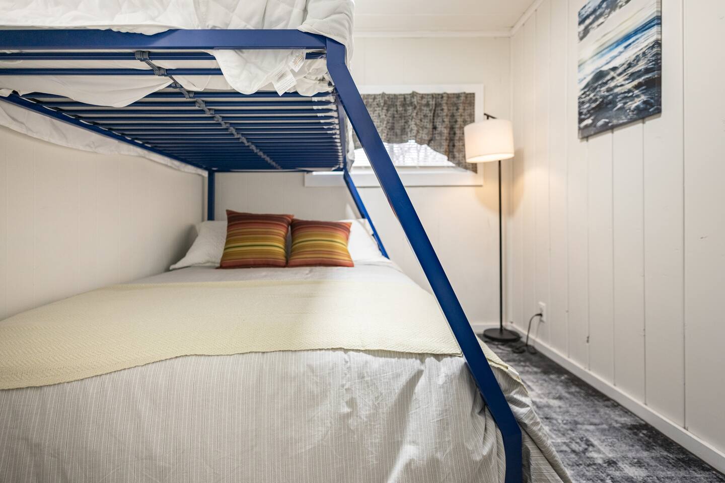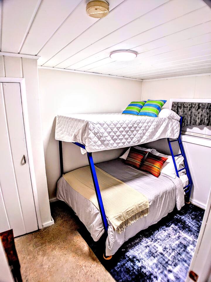 As a remodeled Motel, the space is very cozy. Queen beds were not common in the 50's but we put a new comfy one into the main bedroom. We have a bunk bed that has a Full sized mattress on the bottom and a twin on top in room two. Our ARTICLE brand couch bed folds out for that extra guest or family member. The Vintage has a full kitchen for you to cook in with signature meat's from Walt's Meats next door or warm up something quick before you head out to the beach!