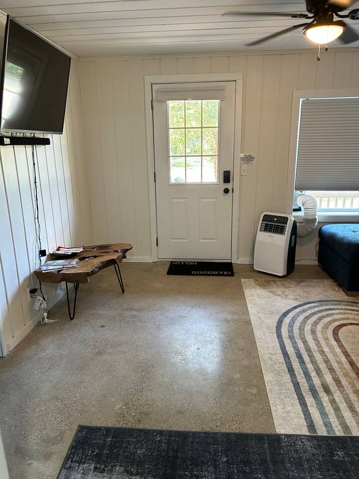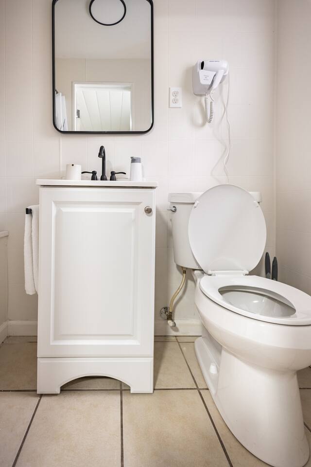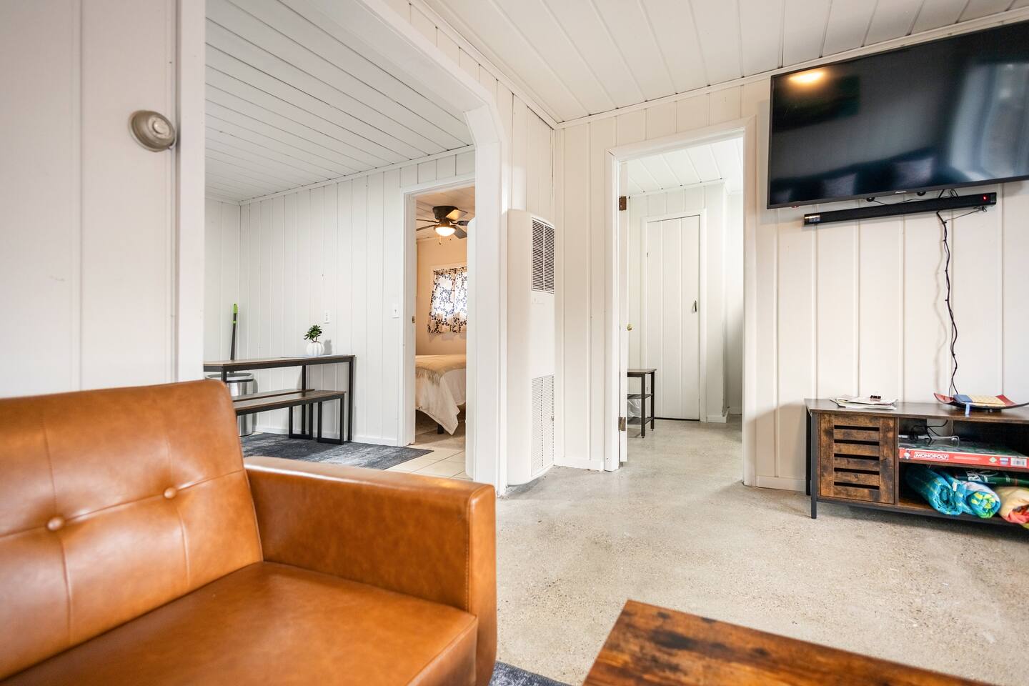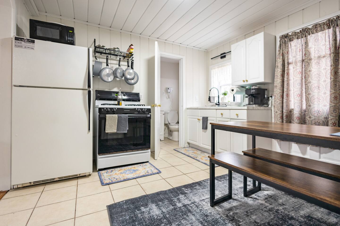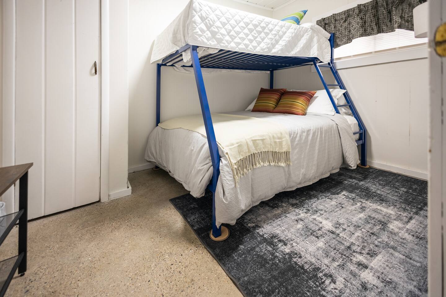 As a remodeled Motel, the space is very cozy. Queen beds were not common in the 50's but we put a new comfy one into the main bedroom. We have a bunk bed that has a Full sized mattress on the bottom and a twin on top in room two. Our ARTICLE brand couch bed folds out for that extra guest or family member. The Vintage has a full kitchen for you to cook in with signature meat's from Walt's Meats next door or warm up something quick before you head out to the beach!